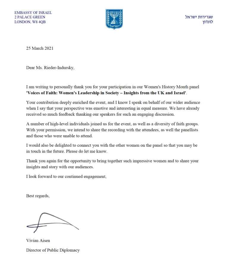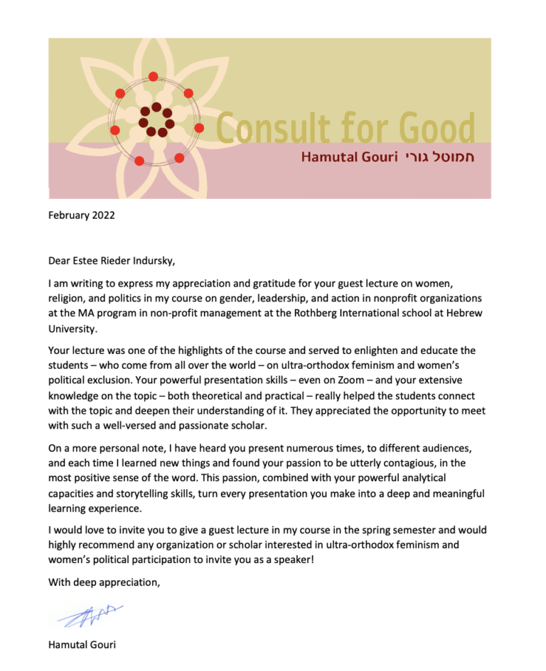 ״הגברת אסתי רידר אינדורסקי השאירה אותנו משתאים, ומדיינים את הנושאים השונים שהיא העלתה הרבה מעבר לזמן ההרצאה״