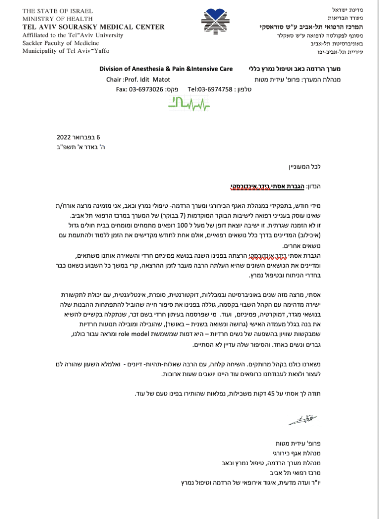 פרופ' עידית מטות, מנהלת אגף כירורגי מנהלת מערך הרדמה, טיפול נמרץ וכאב, מרכז רפואי תל אביב, יו"ר ועדה מדעית, איגוד אירופאי של הרדמה וטיפול נמרץ ​